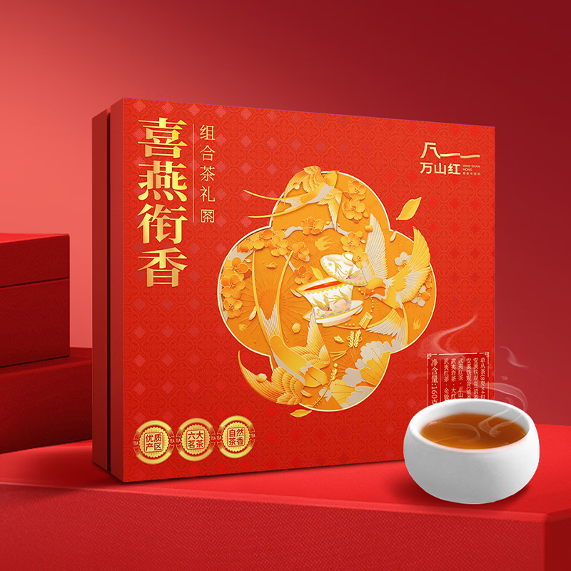包裝喜慶適配禮贈(zèng):紅金主色調(diào) + 燕子、梅花等中式吉祥元素,氛圍濃厚,很適合節(jié)日、走親訪友等送禮場(chǎng)景。