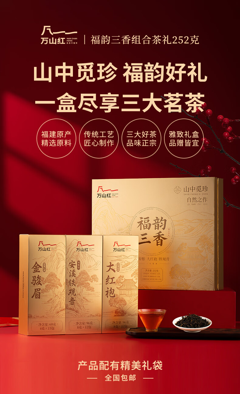 包裝有質(zhì)感:采用金色 + 紅色的禮盒設(shè)計(jì),搭配中式山水紋樣,既顯檔次又有傳統(tǒng)韻味,適合送禮。
